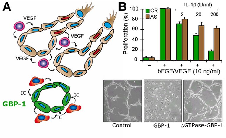 In previous work we have identified the guanylate binding protein-1 (GBP-1) as a novel marker of endothelial cells that are activated by inflammatory cytokines (IC) such as IFN-γ, IL-1β and TNF-α both, in vitro and in vivo. However, GBP-1 was not only a marker but also a key regulator of the antiangiogenic phenotype induced by IC. The protein was necessary and sufficient to mediate the inhibition of proliferation and invasion of EC triggered by IC. In addition, GBP-1 is the first GTPase that was found to be specifically secreted by endothelial cells and its concentration was increased in the cerebrospinal fluid of bacterial meningitis patients. This opens up perspectives to specifically detect the inflammatory activation of the blood vessel system in the serum of patients.